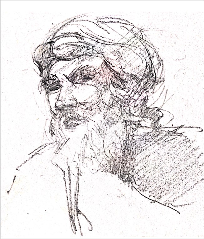 In the background, there is a shelf nailed to the wall. It has bent under the weight of the art books carefully covered in plastic wrap. His pencil box is lying next to him, overflowing with HB pencils, bits of charcoal and eraser stubs. He had asked me if he could sketch something during our interview.